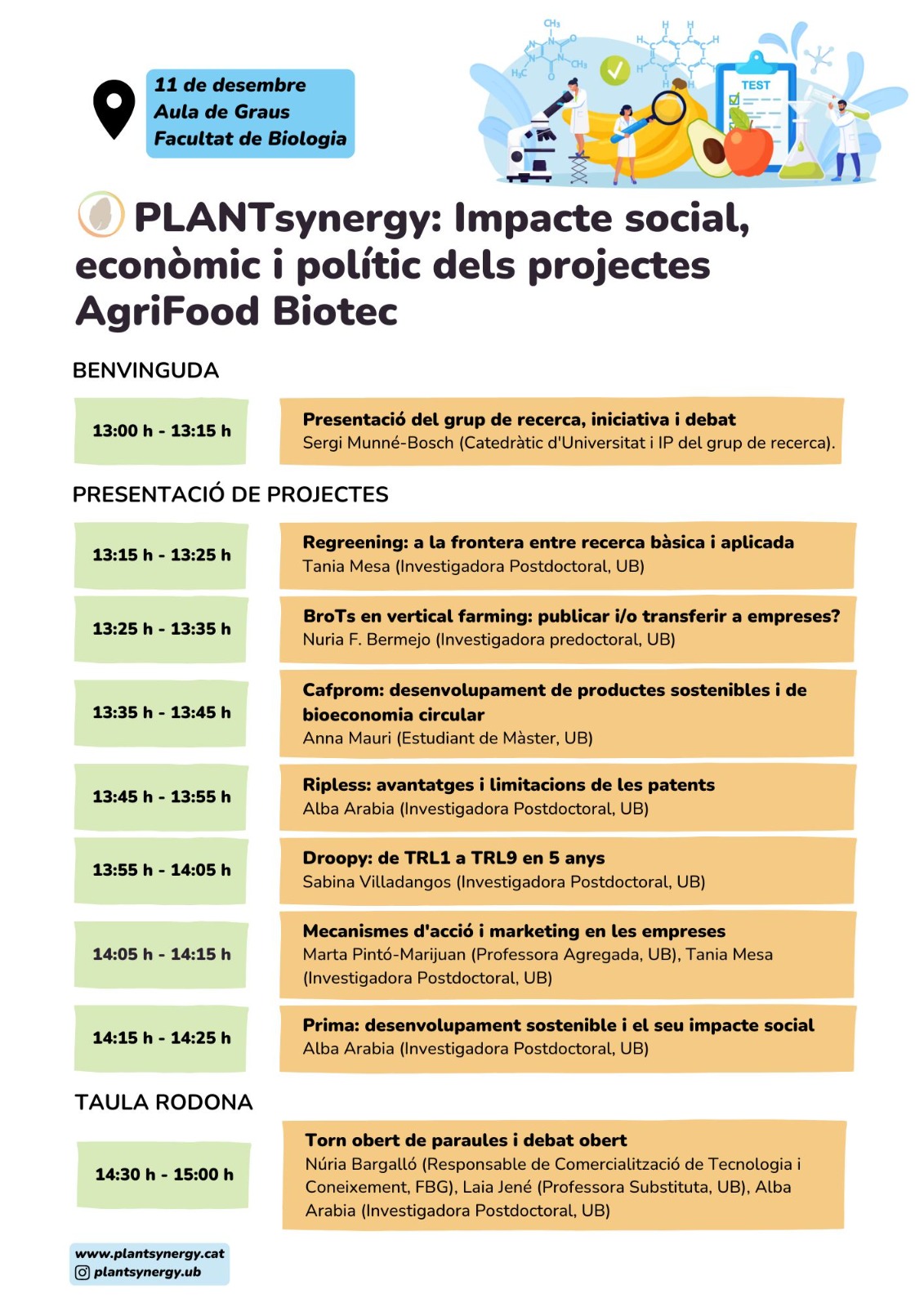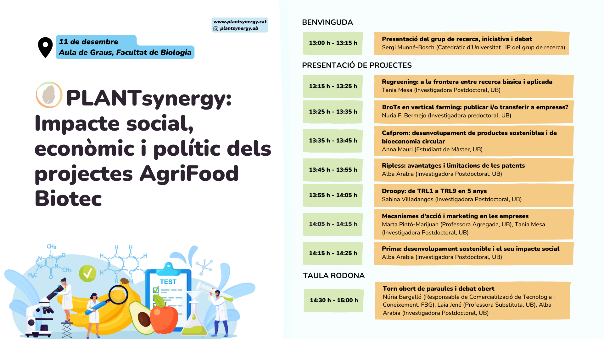 The session will begin at 13:00 with an introduction by Prof. Sergi Munné-Bosch, Principal Investigator of PLANTsynergy. A series of short presentations will follow, each highlighting a project carried out by the group. Topics include research at the frontier between basic and applied science, vertical farming and knowledge transfer, sustainable product development and circular bioeconomy, patent opportunities and limitations, completing all technology readiness levels, and the influence of marketing and mechanisms of action within biotech companies. The event will conclude with a roundtable discussion from 14:30 to 15:00, providing an open space for questions, debate and exchange among researchers, innovation specialists and attendees.